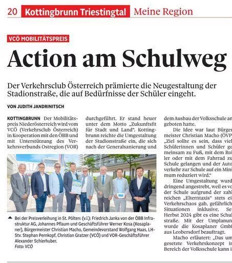 Das von uns geplante Projekt „Schulumfeld Stadionstraße – Erlebnisweg Volksschule“ in Kottingbrunn wurde mit dem AQUILA 2025, dem österreichischen Verkehrssicherheitspreis des Kuratoriums für Verkehrssicherheit (KFV) ausgezeichnet. Nach dem Gewinn des VCÖ-Mobilitätspreises Niederösterreich 2024 ist das bereits die zweite große Ehrung für dieses Projekt – und für uns ein schönes Zeichen, dass engagierte Planung Wirkung zeigt.