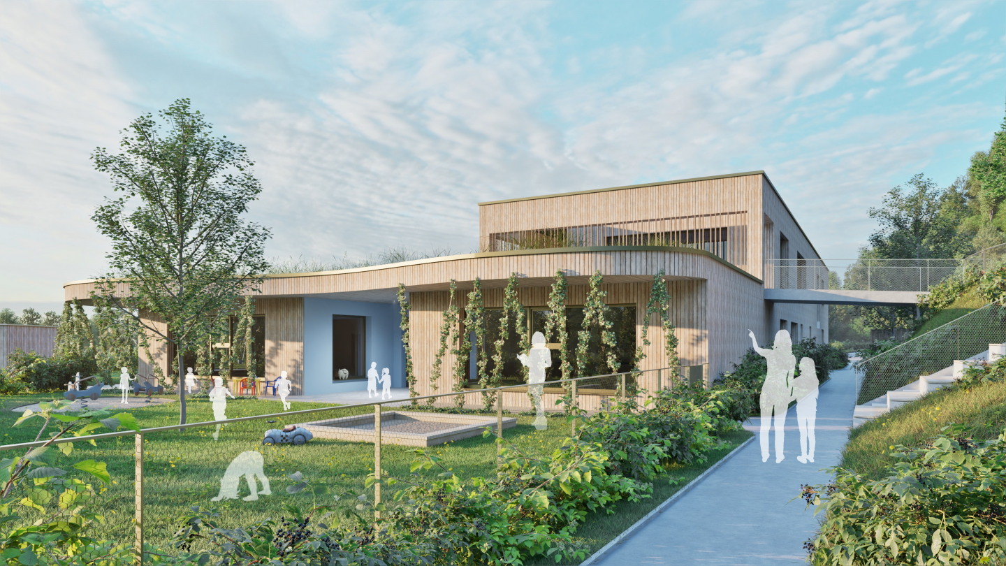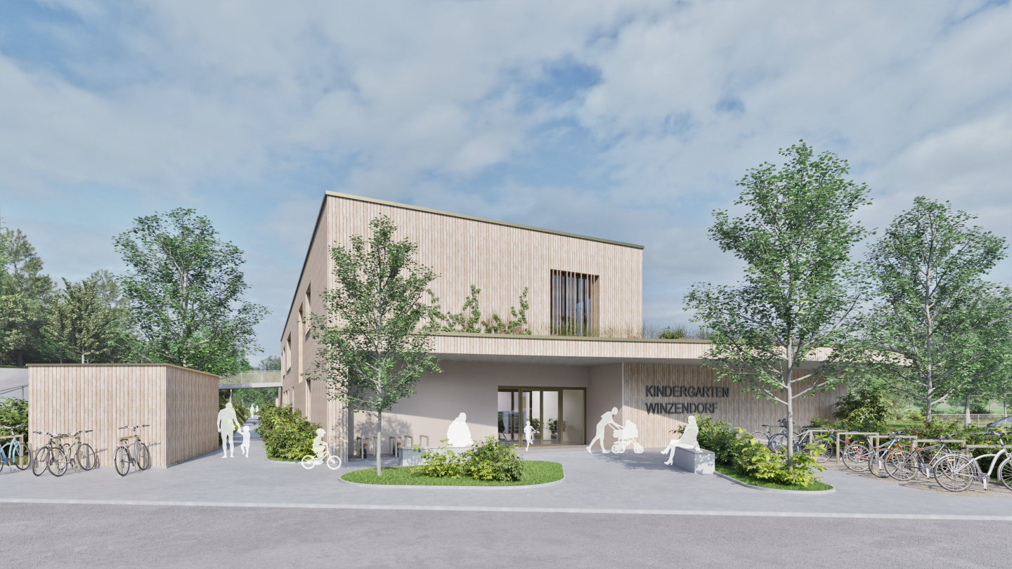 Neubau des 5-gruppigen Kindergartens in Holzmassivbauweise mit der Möglichkeit der späteren Erweiterung auf bis zu 8 Gruppen