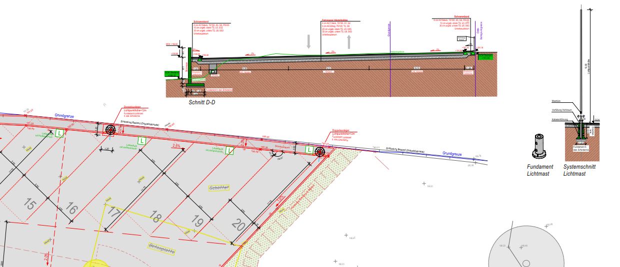 An die Schrägstellplätze angrenzend wird jeweils ein Schrammbord mit einer Breite von ca. 1,00 m errichtet, welcher durch einen Hochbordstein mit einer Absatzhöhe von 10 cm abgegrenzt wird. Der Schrammbord dient einerseits der Verbesserung der Aufstellung des Lkw im Stellplatz, andererseits der Situierung der Ladestationen, der Powerunits (Verteilerkästen) und der Beleuchtung.
