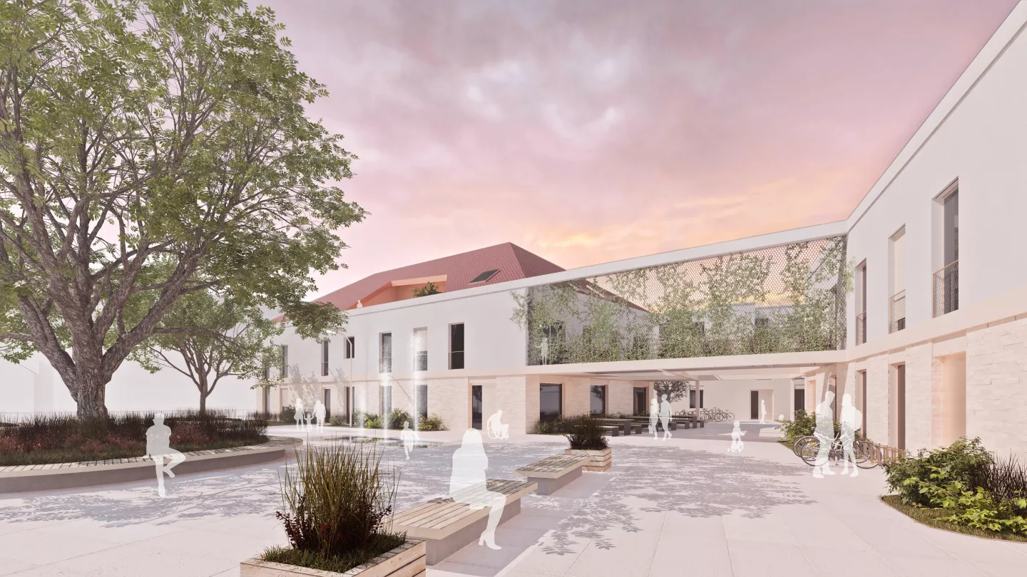 Unser Entwurf gibt Bad Erlach eine neue, selbstbewusste Mitte, die den bestehenden dörflichen Charakter respektiert und gleichzeitig neue Qualitäten schafft. Herzstück ist der Kurpark rund um die bestehende Platane, die wir als identitätsstiftenden Anker bewusst gestärkt haben. Der Park wird zu einem großzügigen, offenen Aufenthalts- und Begegnungsraum, der gleichermaßen Alltag und besondere Anlässe tragen kann.