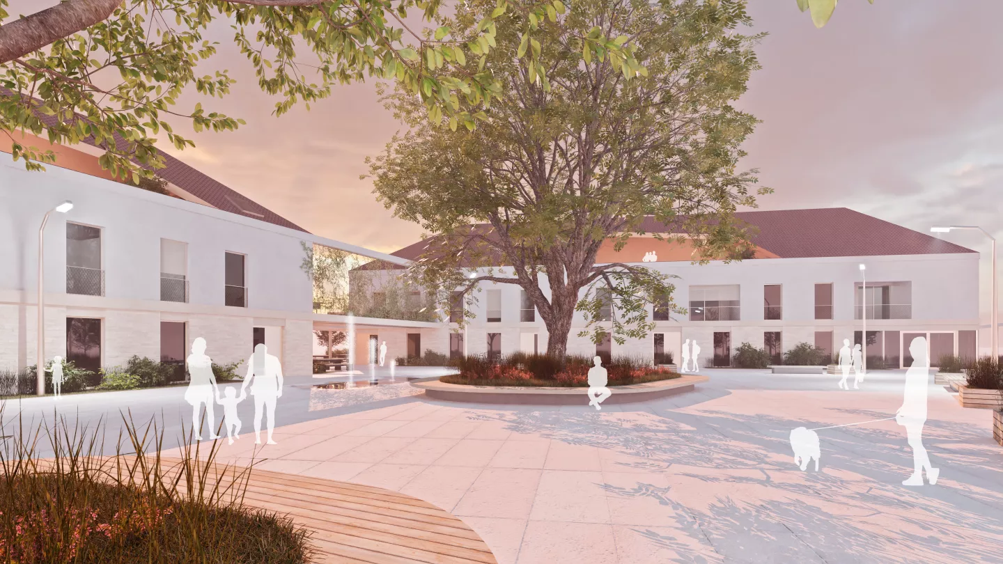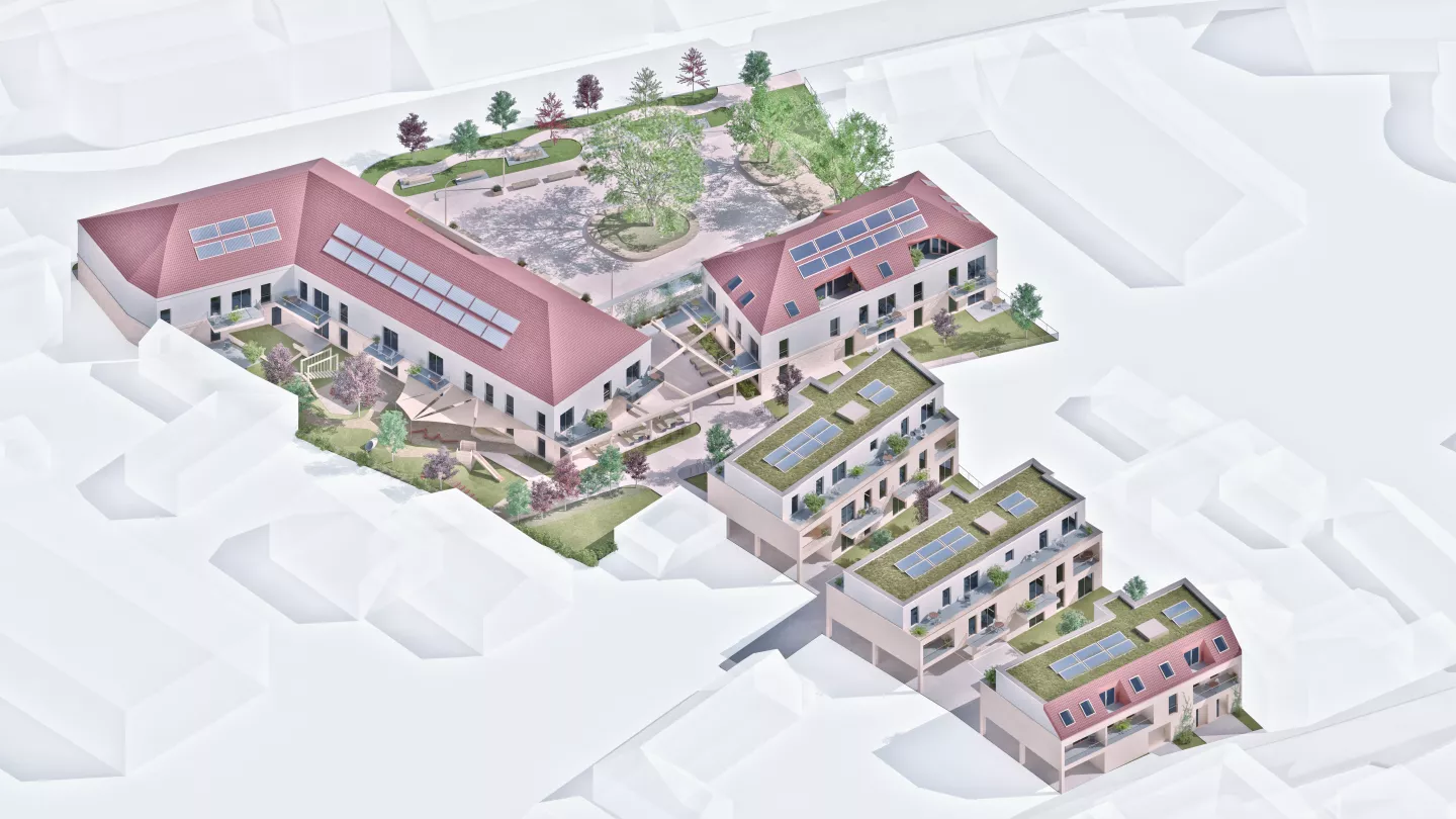 Die beiden gemischt genutzten Baukörper schaffen durch Nahversorgung, Gastronomie, Dienstleistungen und Shared-Office-Strukturen kurze Wege und eine lebendige Erdgeschoßzone. Ergänzend fügen sich drei Wohngebäude mit insgesamt 38 geförderten Wohnungen sensibel in das Ortsgefüge ein und bieten hochwertige, leistbare Wohnqualität.