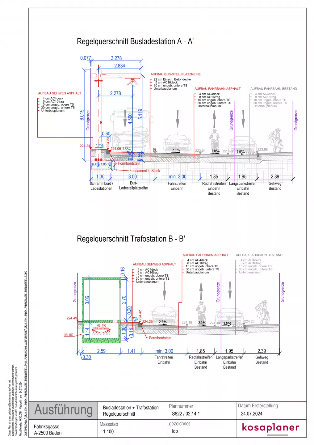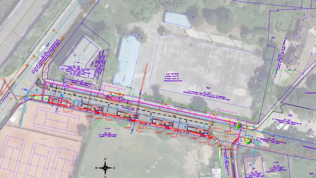 Durch kosaplaner wurde die gesamte Verkehrsplanung inkl. Schleppkurvenprüfungen für Busse und Feuerwehr, Änderung der Gehsteigsituation, Planung der Ladestellen inkl. Fundamentierung und die Versorgung in Abstimmung mit den Wiener Netzen durchgeführt. Im Zuge der Umsetzung mussten Einbauten in Straße und Gehsteig neu- und umgelegt werden. Das Projekt wurde bei der BH Baden verkehrstechnisch und baurechtlich eingereicht.